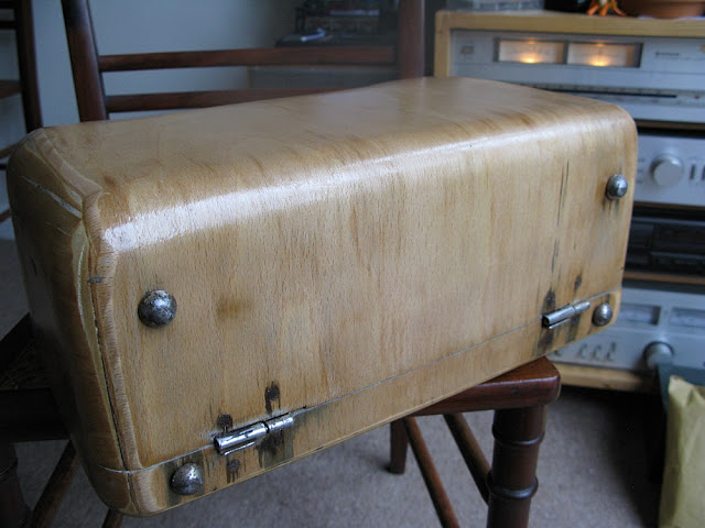 You can see that the case was only intended to be painted - the joinery is crude and the beech veneer marked, though the original paint in those areas was intact. The rubber feet were compacted, crumbling and damaged. Since they are symmetrical, I sliced the damaged surface off, reversed them so the good side is on the outside, and glued them in place after varnishing the case - they'll need tidying inside with a patch of felt.