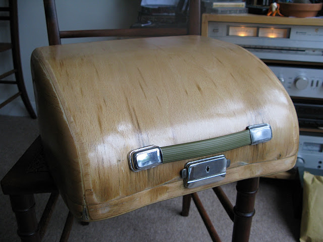 By popular request, a slide show of the stripped plywood case from the Olympia SM3. The case had been somewhere damp as you can tell from the tarnished metalwork and black stain. I haven't tried to conceal any blemishes and the only work on the furniture was to polish the chrome and emery one of the handle fasteners which was all rusty. The tricky part (aside from removing the paint) was to protect the interior which is flocked (not fabric lined) and easily damaged by clamping in a workbench. It wasn't in great condition to start with. Clean flock by dabbing, not wiping.